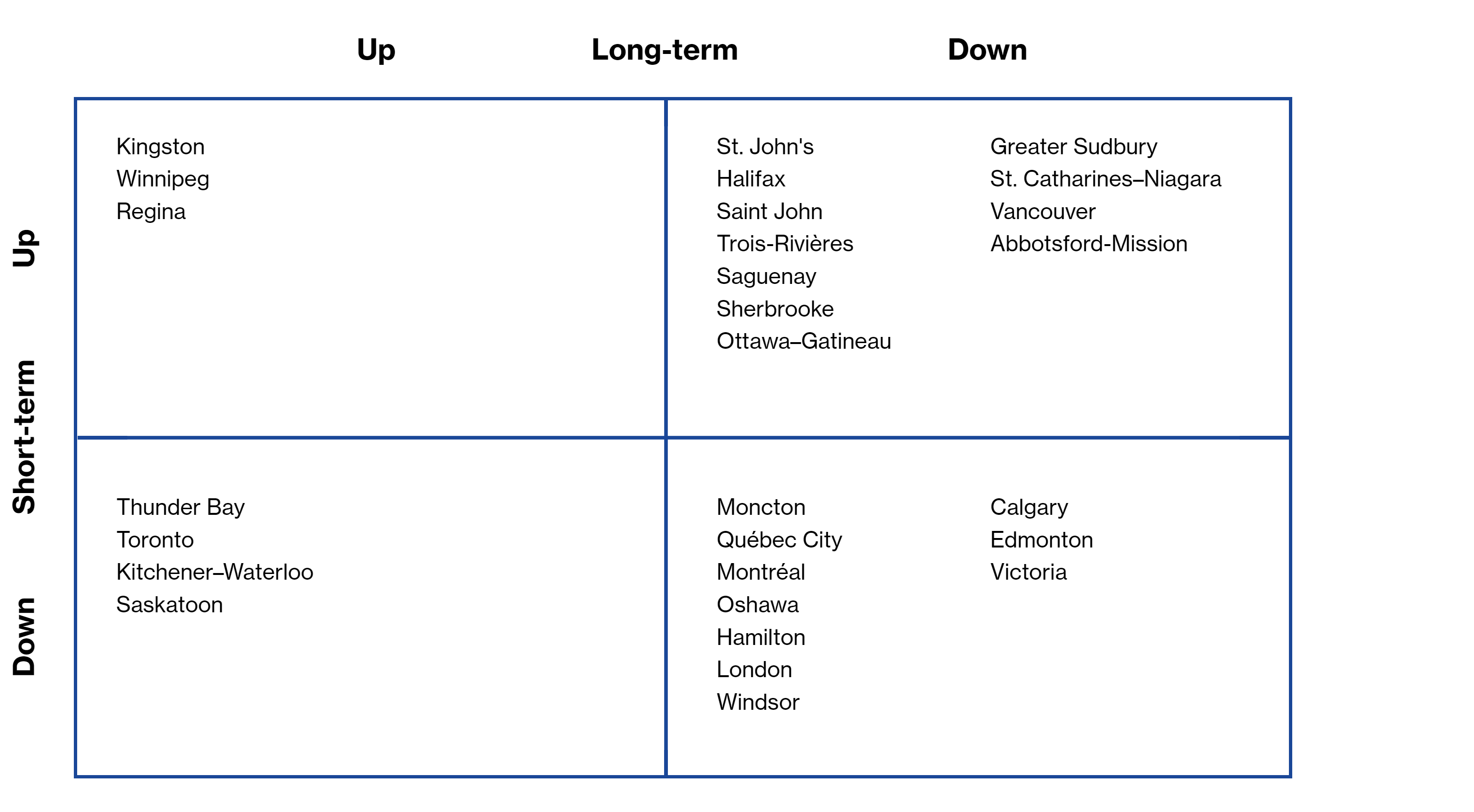 Note: Positioning in the quadrant indicates short- and long-term expectations for each CMA’s housing market. The best position would be in the up–up quadrant, which shows positive prospects for both short- and long-term growth. The worst position would be the down–down quadrant.