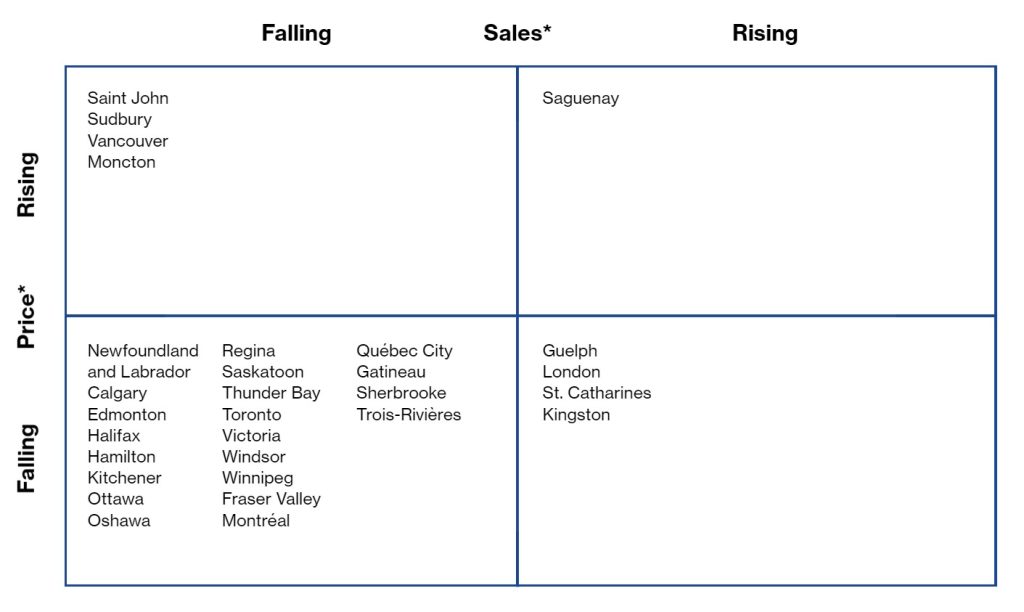 - Sales and listings trends were mixed. Transactions dropped in 22 of our 30 markets in September, with nine areas reporting declines of at least 5 per cent. Still, volumes were below a year earlier in 29 areas. Listings declines were less widespread in September, with 15 areas witnessing drops, but they still exceeded year-earlier volumes in 17 jurisdictions. Prevalent sales easing slackened many markets last month; the sales-to-listing ratio fell in 22 areas. We find 22 markets were balanced in September, up from 21 areas in August. Soft listings have helped push Sudbury, Saguenay, Saint John, and Newfoundland and Labrador into a sellers’ state. Buyers’ conditions prevail in four areas. Prices continue to moderate; 16 areas saw month-to-month declines in September, although values remain above year-earlier levels in 22 markets.