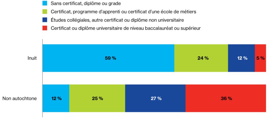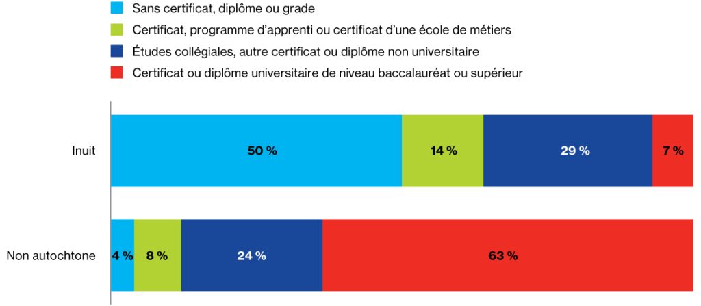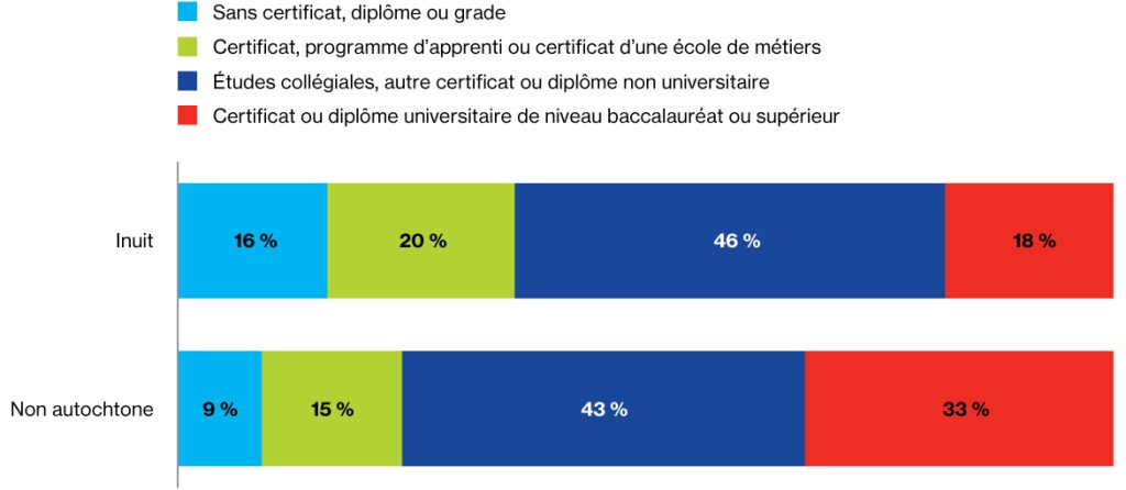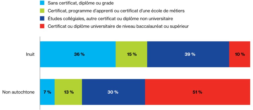 Dans les quatre régions de l’Inuit Nunangat, les Inuits sont plus susceptibles que les travailleurs non autochtones d’occuper des emplois peu qualifiés et moins bien rémunérés. Cela creuse l’écart de revenu. Le niveau d’éducation des travailleurs inuits et non autochtones constitue une autre importante source de disparité.