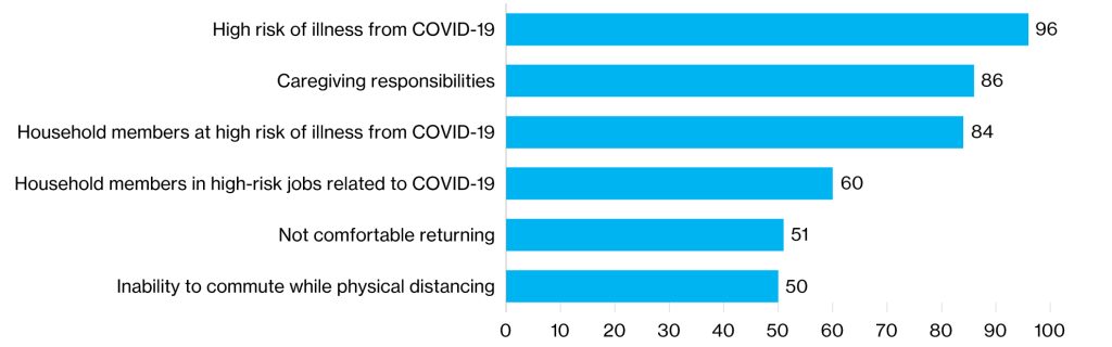 Most organizations will ask employees at high risk of severe illness from COVID-19 to remain home. Risk factors include a weakened immune system, age above 65, and underlying medical conditions such as heart disease, hypertension, and diabetes.