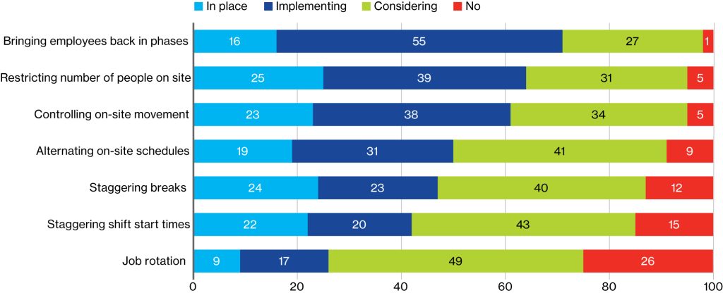 With restrictions lifting and workplaces starting to reopen, major concerns among employers include ensuring appropriate physical distancing and the potential for a site outbreak. Therefore, it is not surprising that the majority of organizations are bringing employees back in phases and restricting the number of people on site.