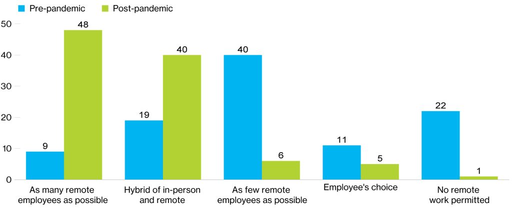 Q: Which of the following best reflects your organization’s remote work approach pre- and post-pandemic?