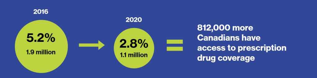 The uninsured gap is almost half what it was six years ago. Since then, 812,000 Canadians have become eligible for prescription drug coverage.