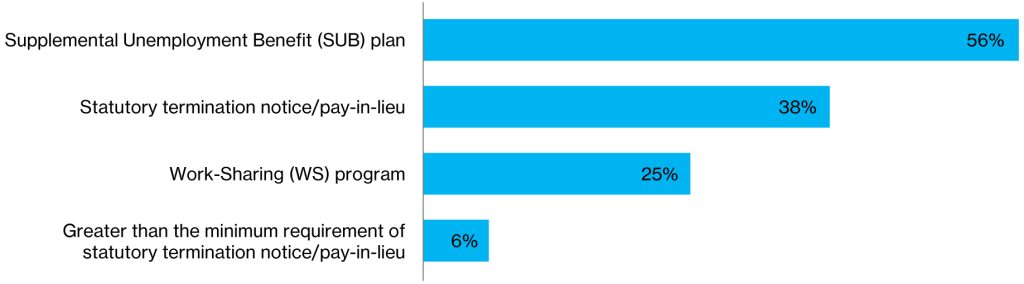 Of the 30 per cent of organizations that have had to start reducing their workforce, many are tapping into government programs to support their employees. Among those using Supplemental Unemployment Benefit (SUB) plans, organizations are topping employees up to 70–95 per cent of their pay for an average of 15 weeks.